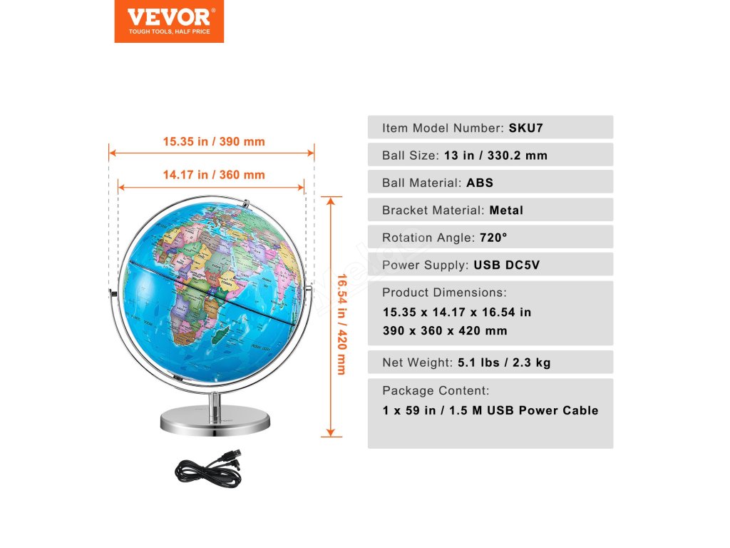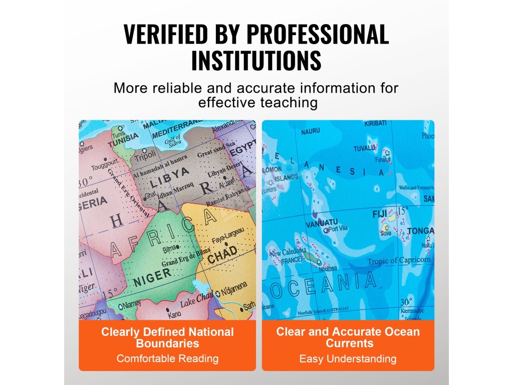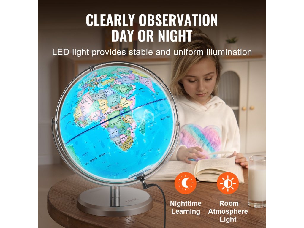 Náš 13palcový/330,2mm glóbus zobrazuje mapu a hranice světa s úžasnými detaily. Díky tisku ve vysokém rozlišení, který zajišťuje zřetelné hranice a popisky, mohou děti vizuálně prozkoumat země světa, hlavní města, mořské proudy, jezera a linie zeměpisné šířky a délky. Pokryje všechny vzdělávací potřeby!