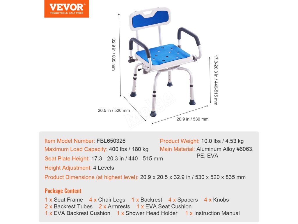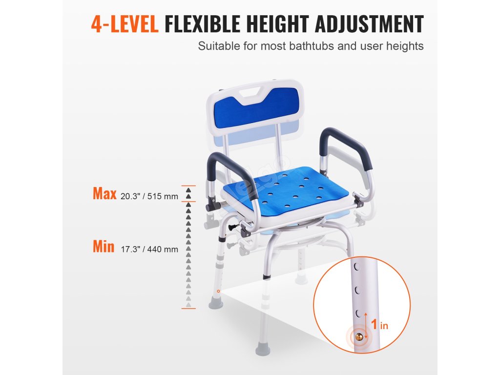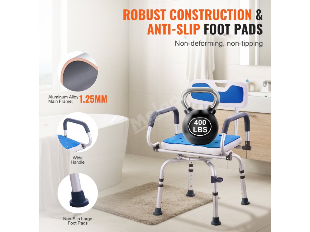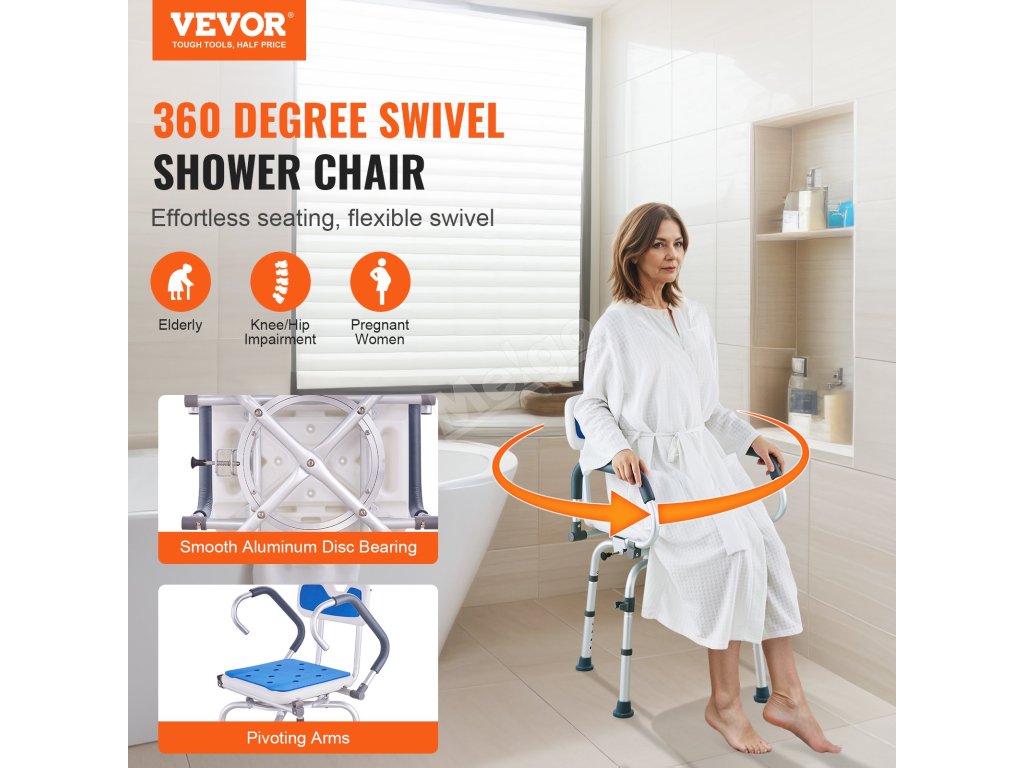 Sprchujte se bezpečněji a pohodlněji s otočnou židlí VEVOR 360°. Toto sprchové křeslo je ideální pro seniory, zdravotně postižené a těhotné ženy, je vybaveno 360° otočným sprchovým sedátkem, otočnými područkami, 4 nastavitelnými výškovými stupni a nosností 400 liber pro maximální pohodlí.