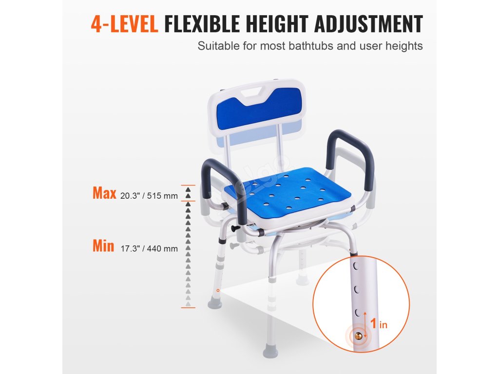 Sprchujte se bezpečněji a pohodlněji s otočnou židlí VEVOR 360°. Toto sprchové křeslo je ideální pro seniory, zdravotně postižené a těhotné ženy, má otočné sedadlo o 360°, 4 nastavitelné výškové stupně, nosnost 400 kg a široké područky pro maximální pohodlí.