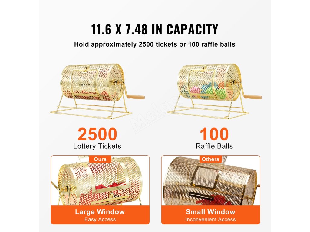 Díky rozměrům 11,6 x Ø7,48 palce / 295 x Ø190 mm pojme otočná klec na tombolové lístky přibližně 2 500 lístků nebo 100 pingpongových míčků, takže je vhodná zejména pro velké akce nebo tomboly s mnoha účastníky.