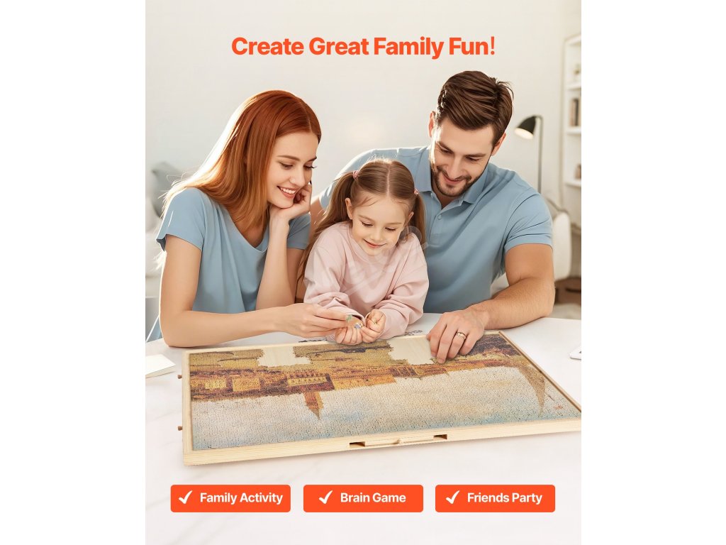 Otázka: Odpověď: Vejde se na tuto desku 2000 dílků puzzle? Tato deska je navržena tak, aby se na ni vešly puzzle standardní velikosti s 2000 dílky. Deska má rozměry 1020 x 745 mm / 40 x 29 palců, což vyhovuje většině skládaček s 2000 dílky. otázka: Jaká je velikost této krabice? Jak mohu skládačku uložit, až ji dokončím? odpověď: Jak mohu skládat puzzle? Po dokončení jej lze složit pro uskladnění nebo zakrýt ochranným víkem, což umožňuje vystavit jej jako dekorativní rámeček. otázka: Jak stabilní je deska stolu? odpověď: Deska stolu je vyrobena z přírodního borovicového dřeva, které nabízí stabilní konstrukci, jež vydrží pohyb při skládání puzzle a udrží puzzle neporušené. otázka: Je sestavení obtížné? odpověď: Organizér puzzle je navržen pro okamžité použití po vybalení z krabice, takže je ideální pro kempování, cestování a další přenosné aktivity.