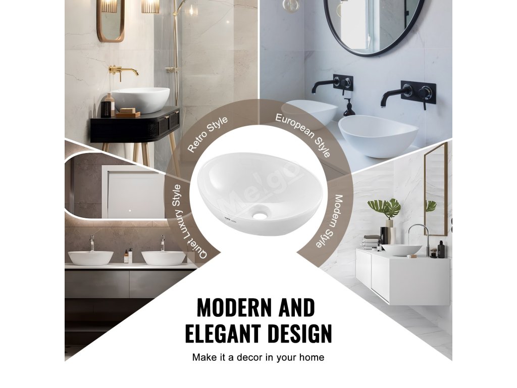 Tento dřez s minimalistickým oválným tvarem a decentní bílou barvou vyzařuje krásu a luxus. Doplní různé styly interiérů a mezi majiteli domů je oblíbené pro použití v koupelnách a toaletních stolcích. Hodí se také do hotelů, karavanů, restaurací, kancelářských budov a dalších prostor.