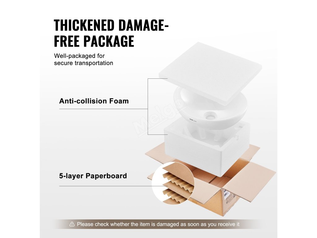 Pánev je obklopena pěnovým polstrováním, které zabraňuje poškození při přepravě. Před instalací umyvadla jej zkontrolujte, zda nebylo při přepravě poškozeno. Pro jednoduchou instalaci ve 4 krocích postupujte podle pokynů v návodu.