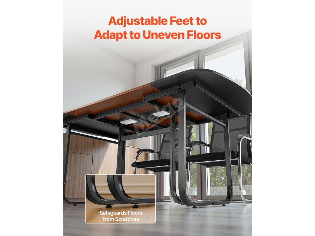 Tento konferenční stůl se zesílenou deskou a vyztuženými kovovými nohami poskytuje vynikající podporu hmotnosti. Pomocné opěrné nohy a nastavitelné podložky pod nohy zajišťují jeho stabilitu a nekolísání, což zaručuje bezpečné používání během rušných jednání.