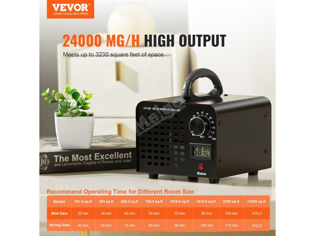 Díky výkonnému maximálnímu výstupu ozonu 24 000 mg/h a ploše pokrytí 3 230 čtverečních stop je prioritou ozonového generátoru VEVOR vaše zdraví, protože účinně odstraňuje zápach, kouř a znečišťující látky ze vzduchu. Je vybaven ukazatelem vlhkosti a časovačem na 0-120 minut, což zajišťuje neustálou kontrolu vašeho vnitřního prostředí.