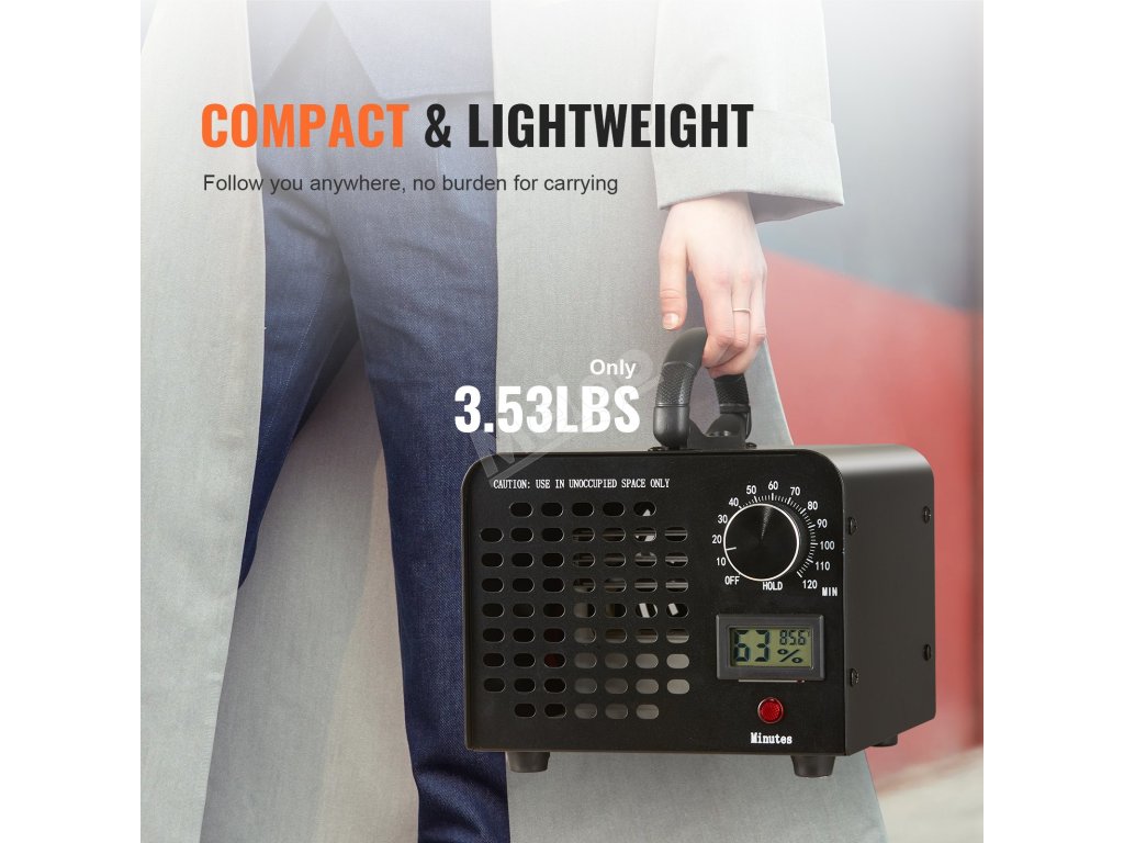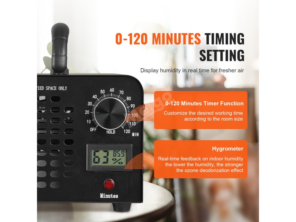 Tento komerční generátor ozonu, vybavený ukazatelem vlhkosti a časovačem na 0-120 minut, inteligentně monitoruje vnitřní prostředí, aby zajistil nejlepší provoz. Můžete libovolně nastavit požadovanou dobu provozu až na 120 minut a pomocí režimu "HOLD" udržovat nepřetržitý provoz.