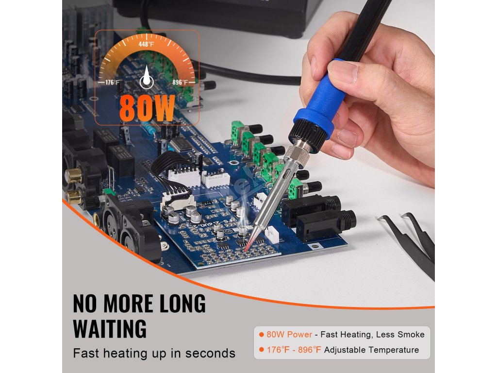 Inteligentní regulace teploty pro rychlejší a přesnější ohřev! Díky vysokému výkonu 80 W, PID regulaci teploty a nastavitelné teplotě 176℉-896℉ zajišťuje tato pájecí stanice efektivní pájení, ideální pro opravy desek plošných spojů, opravy šperků, projekty pro kutily atd.