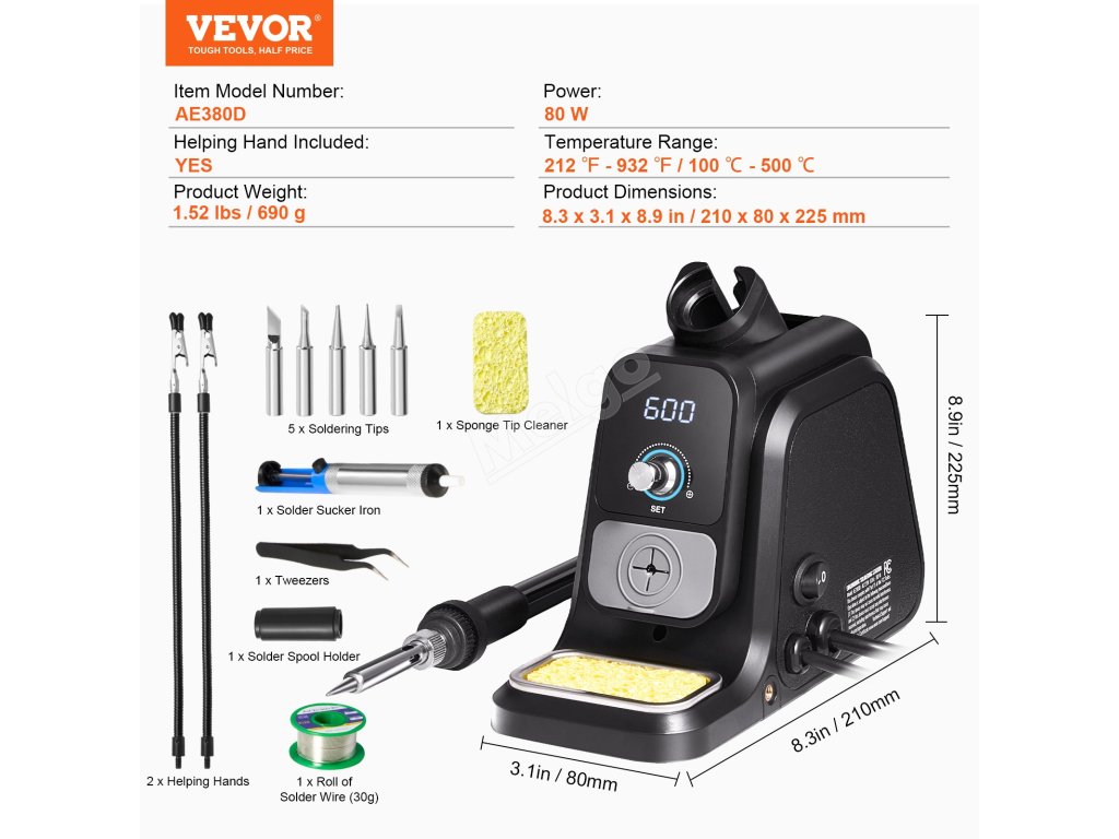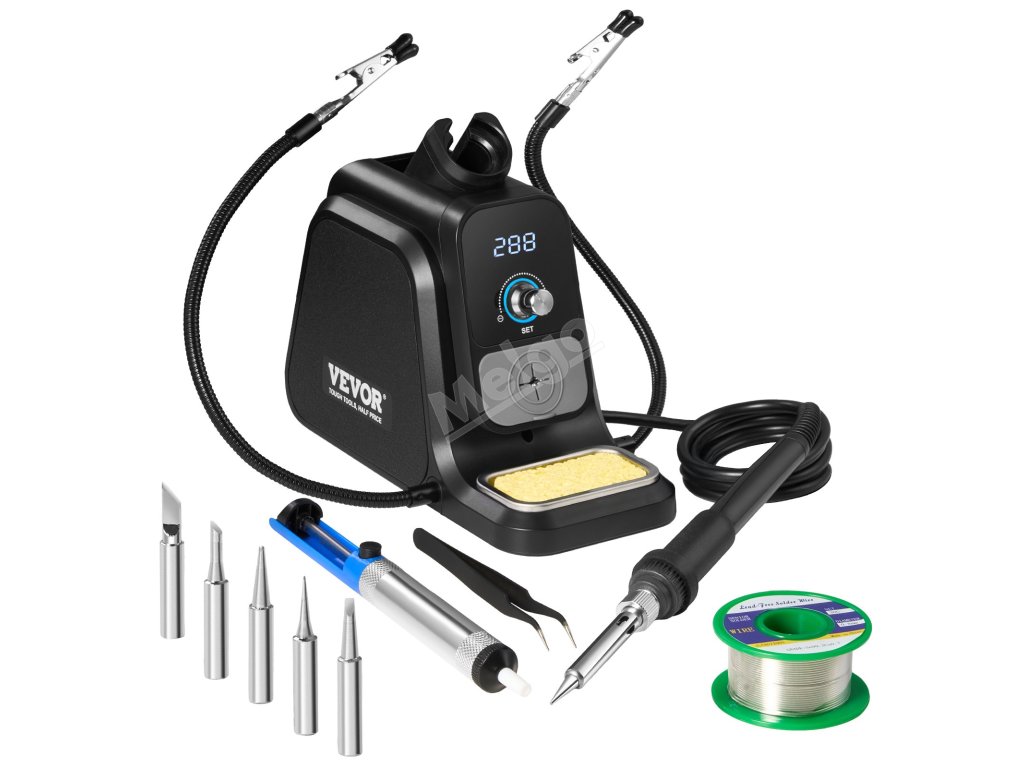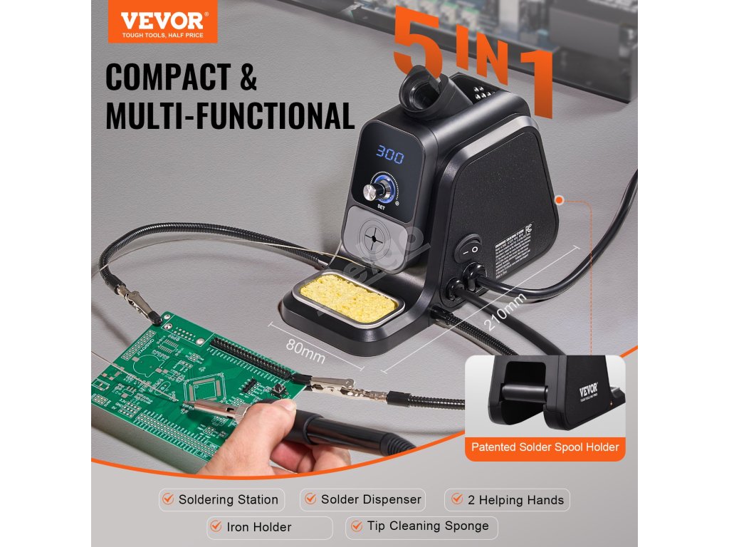 Toto pájecí pracoviště je vybaveno patentovaným držákem pájecí cívky, který udržuje pájecí drát bezpečně na místě a usnadňuje práci. Vyhovuje různým potřebám díky 2 pomocným ramenům, která drží předměty stabilně a uvolňují ruce, a 5 univerzálním pájecím hrotům, které lze snadno vyměnit.