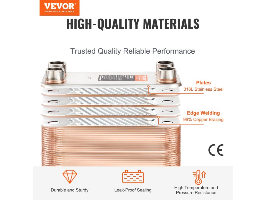 Náš výměník tepla je kompaktní a lehký a nabízí vynikající tepelný výkon. Je vyroben z nerezové oceli 316L a z 99 % z měděného pájení pro dlouhou životnost a je ideální pro solární ohřev, rekuperaci tepla z oleje, chlazení motorů a kondenzaci.