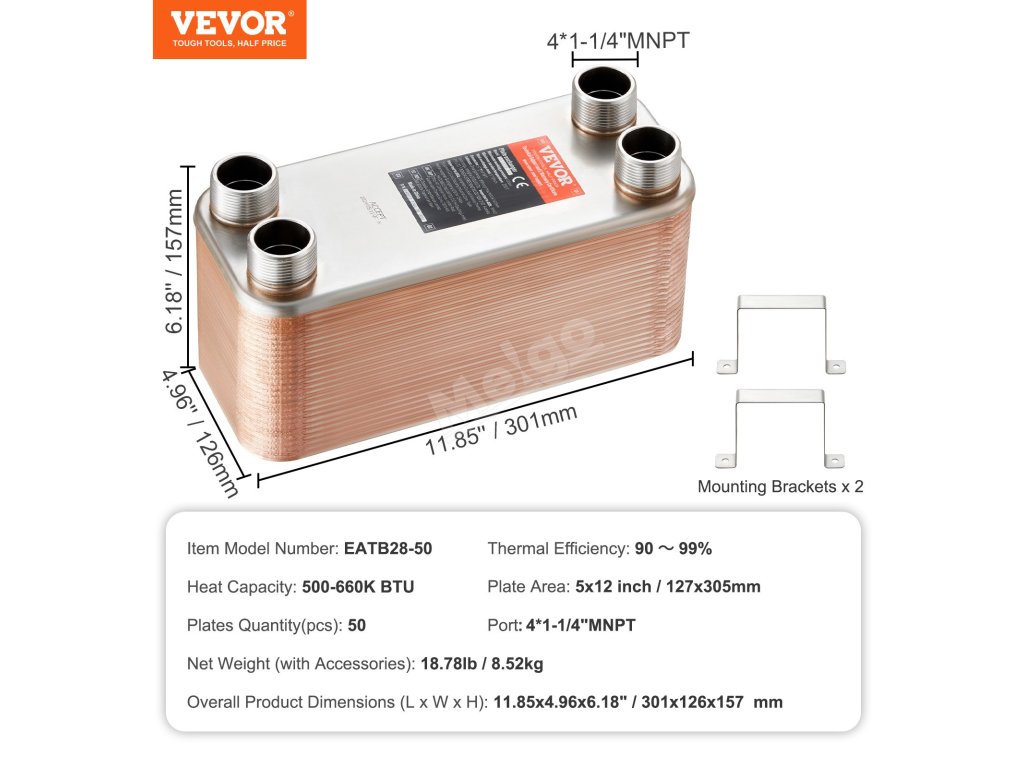 Náš výměník tepla je vybaven rozhraním 1 ¼" MNPT s hladkým závitem pro snadné a pohodlné připojení.