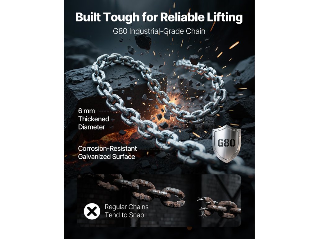 Vyrobeno z průmyslového řetězu G80, který je konstruován tak, aby odolal velkému zatížení. Pozinkovaná povrchová úprava nabízí odolnost proti korozi a trvanlivost a je vhodná do různých pracovních podmínek.
