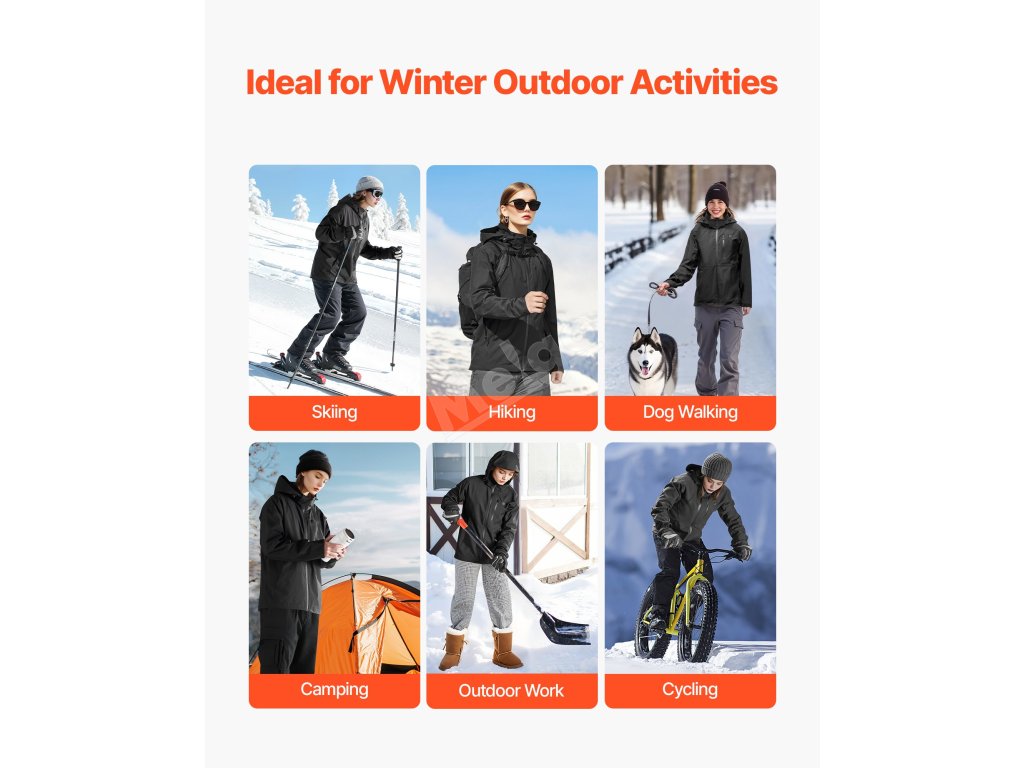 Má 5 vyhřívacích zón z uhlíkových vláken (paže, břicho, záda) se 3 úrovněmi tepla až do 140℉. Napájení zajišťuje 7,4V baterie s kapacitou 8000 mAh pro 6-10 hodin ohřevu. Voděodolná tkanina vhodná pro turistiku, kempování, lyžování, rybaření a lov.