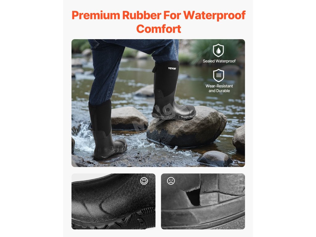 Gumené čižmy sú vyrobené z vysokokvalitnej gumy, ktorá ponúka vynikajúcu odolnosť voči mokrým podmienkam a priedušnosť, vďaka čomu vás udrží v suchu a pohodlí počas outdoorových aktivít. Stielka EVA poskytuje pohodlné nosenie, zatiaľ čo ľahká konštrukcia vám umožní ľahko riešiť rôzne situácie.