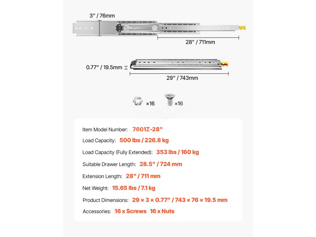 Tyto zásuvkové kolejnice vyrobené z vysoce kvalitní oceli mají vysokou tvrdost, velkou stabilitu a odolnost. Pracují se správným uložením a nízkou hlučností. Jsou dodávány s podrobnými vodítky a praktickými šrouby. Jsou ideální pro ukládání do skříní, průmyslových zásuvek, komerčních zařízení, upravených vozidel atd.