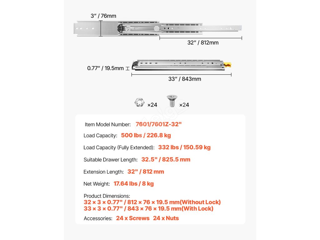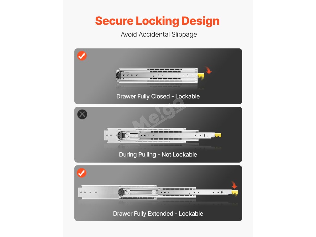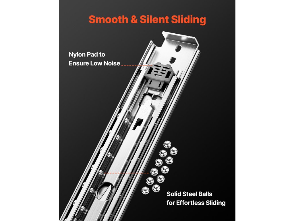 Tyto zásuvkové kolejnice vyrobené z vysoce kvalitní oceli mají vysokou tvrdost, velkou stabilitu a odolnost. Pracují se správným uložením a nízkou hlučností. Jsou dodávány s podrobnými vodítky a praktickými šrouby. Jsou ideální pro ukládání do skříní, průmyslových zásuvek, komerčních zařízení, upravených vozidel atd.