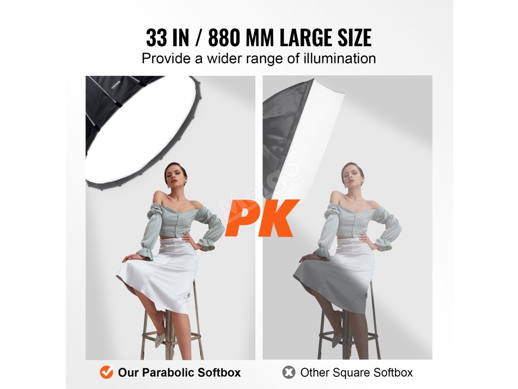 Tento softbox je vyroben z žeber deštníku z tvrzeného ocelového drátu, která zajišťují pevnější uchycení parabolického tvaru. To zajišťuje, že žebra nelze snadno deformovat, mají silnou pružnost, jsou lehká a odolnější.