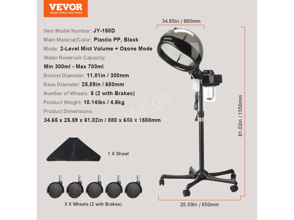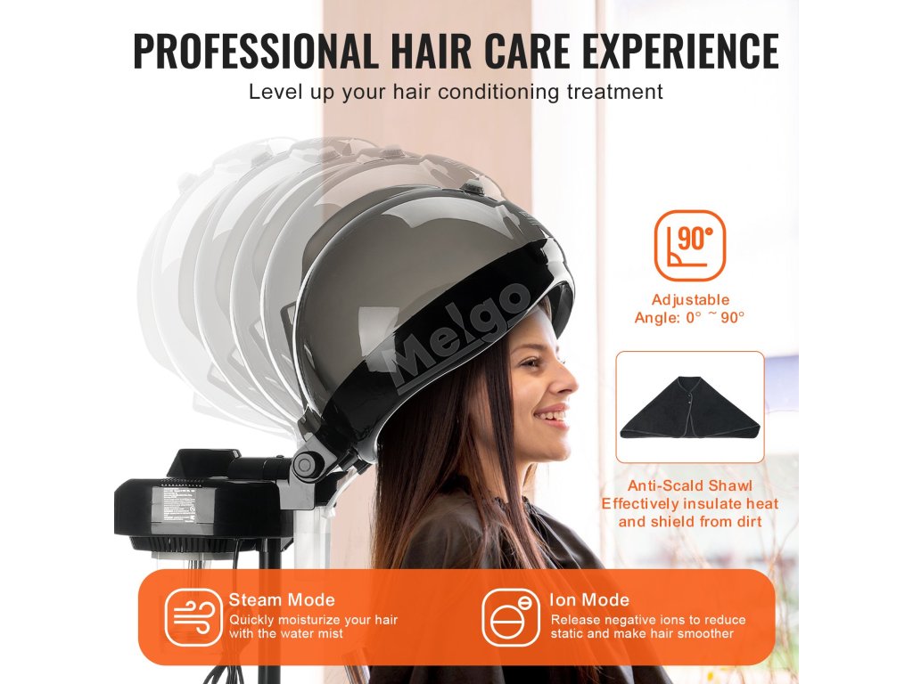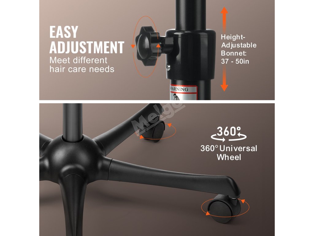 Aby se tento kosmetický napařovač vlasů přizpůsobil uživatelům s různou výškou, je vybaven nastavitelnou výškou v rozmezí 37 až 50 palců. Je také vybaven kolečky otočnými o 360° (2 s brzdou) pro snadný pohyb, takže si můžete kdykoli a kdekoli užívat péči o vlasy v kvalitě jako ze salonu.