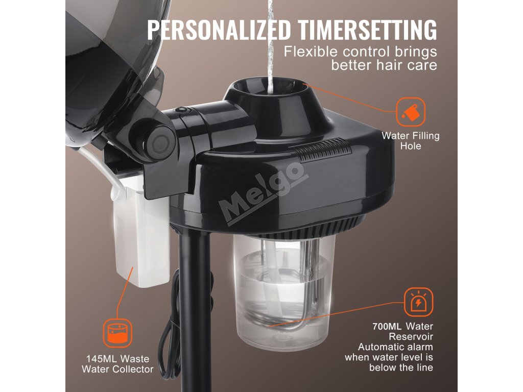 Zajistěte si bezpečnou péči o vlasy pomocí bezpečnostních prvků VEVOR. Velkokapacitní zásobník na vodu o objemu 700 ml, který vás automaticky upozorní na příliš nízkou hladinu vody, sběrač odpadní vody o objemu 145 ml, který zabraňuje úniku vody, a nasazený šátek proti opaření pro tepelnou izolaci a ochranu před znečištěním.