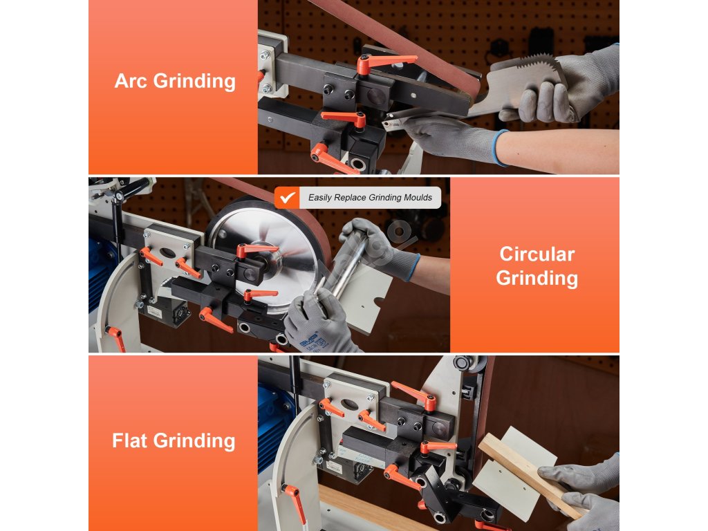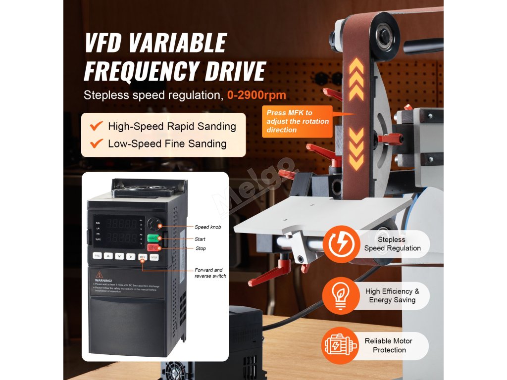 Tato pásová bruska s lineární rychlostí 32 m/min a s frekvenčním měničem VFD umožňuje plynulou regulaci otáček. Bez námahy přepíná mezi rychlým broušením při vysokých otáčkách a jemným broušením při nízkých otáčkách pro zvýšení efektivity práce.