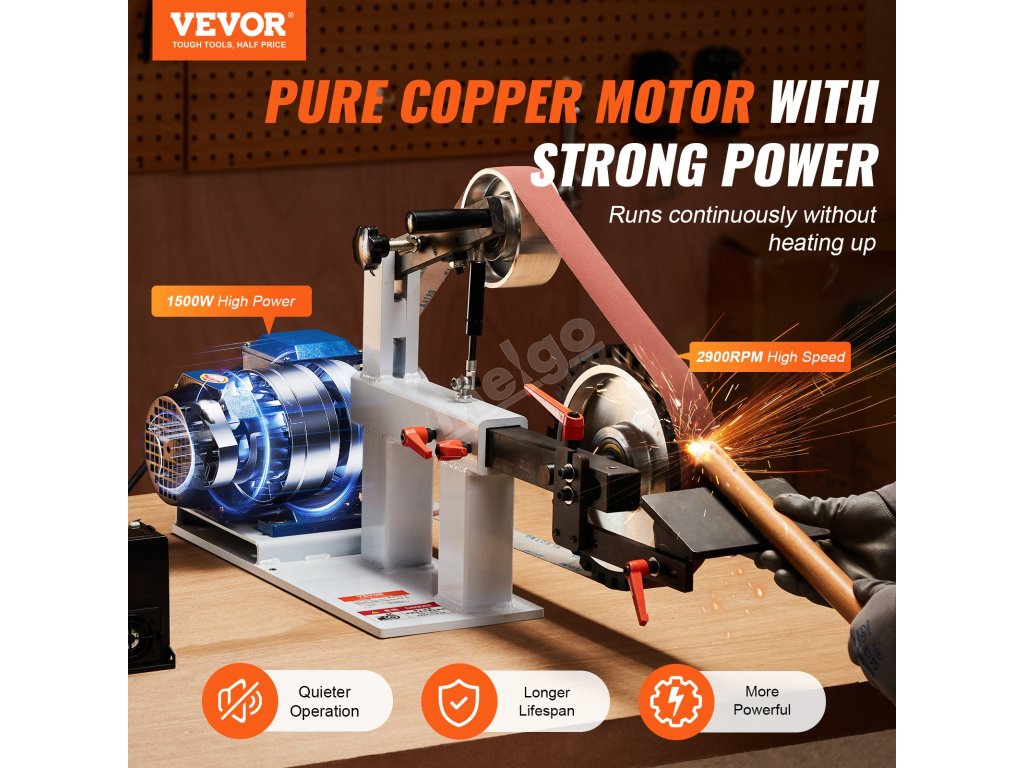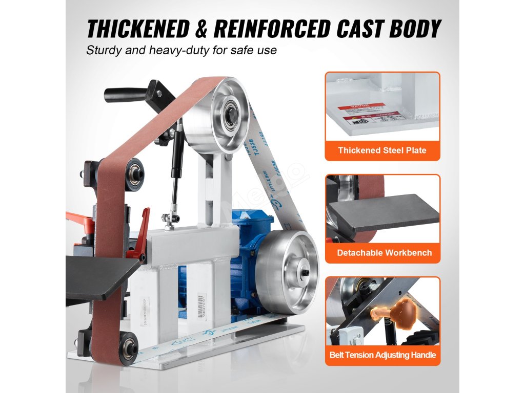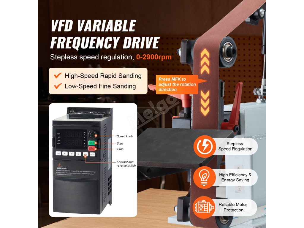 Tato pásová bruska s lineární rychlostí 32 m/min a s frekvenčním měničem VFD umožňuje plynulou regulaci otáček. Bez námahy můžete přepínat mezi rychlým rychloběhem a jemným broušením při nízkých otáčkách a zvýšit tak efektivitu práce.