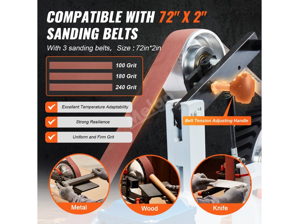 Dodáváme tři brusné pásy o rozměrech 72*2 palce s různou zrnitostí: zrnitost 100, 180 a 240. Můžete si vybrat vhodný pás pro optimální výkon pro vaše brusné úkoly. Máme pro vás vše od hrubého broušení až po jemné leštění.