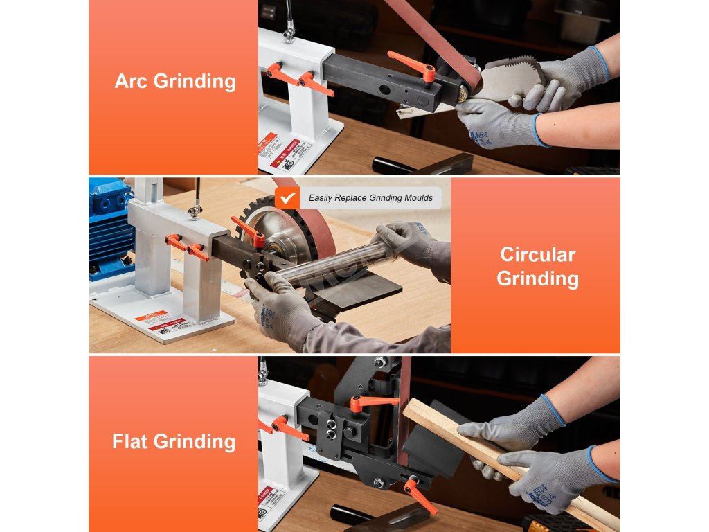 Naše pásová leštička nabízí 3 režimy broušení: kruhové, obloukové a ploché broušení, což poskytuje flexibilitu pro vaše specifické potřeby. Snadno se instaluje a vyměňuje a je ideální pro broušení, leštění a odstraňování otřepů z kovu, dřeva, akrylu, stavebních materiálů a dalších materiálů.