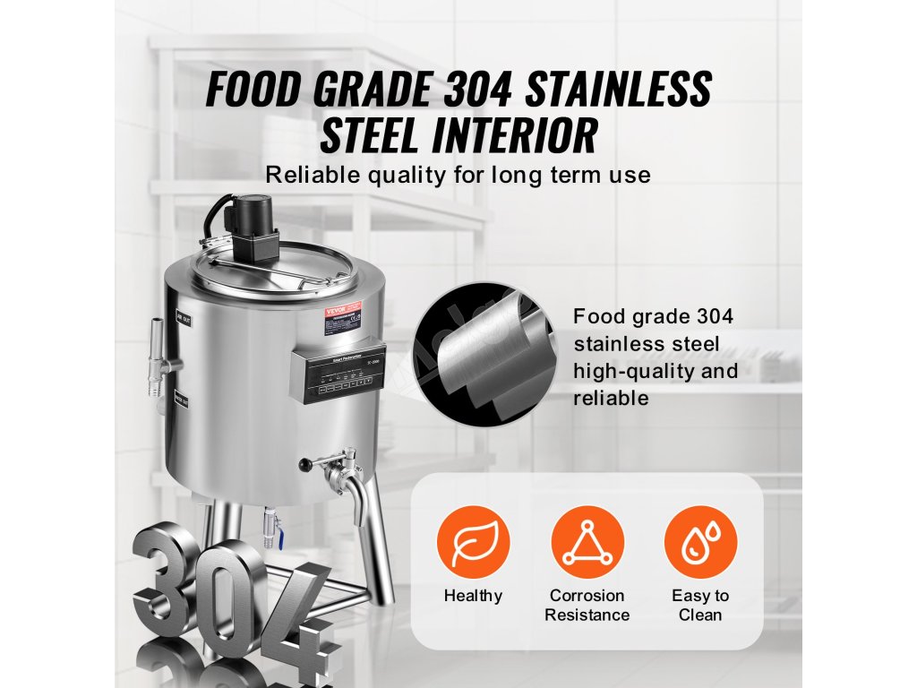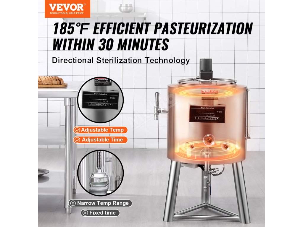 Pasterizátor je vyroben z potravinářské nerezové oceli 304 pro vnitřní nádrž a robustního vnějšího pláště z nerezové oceli, který je odolný proti korozi, zajišťuje snadné čištění a dlouhou životnost.