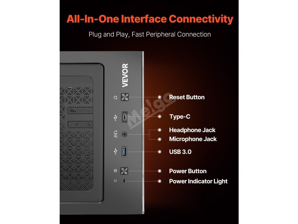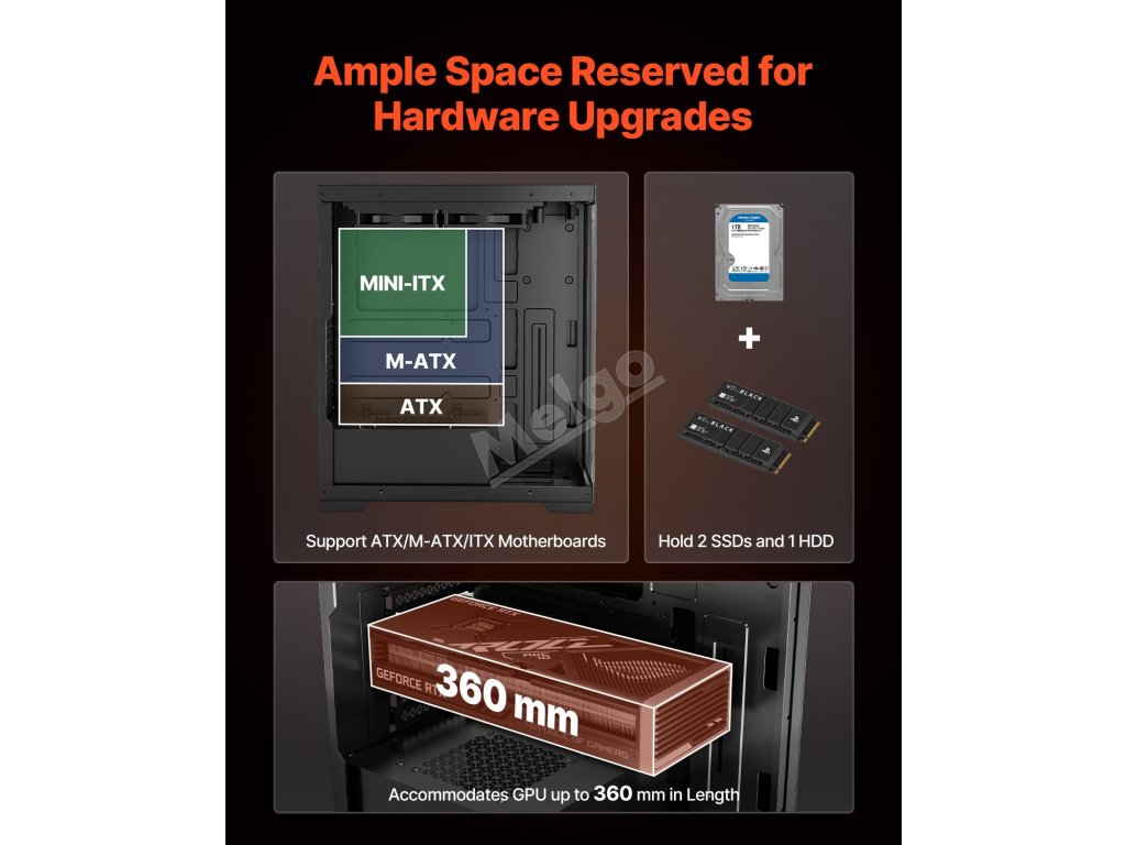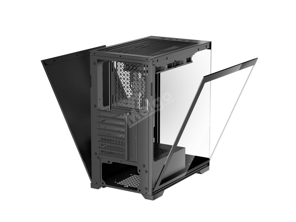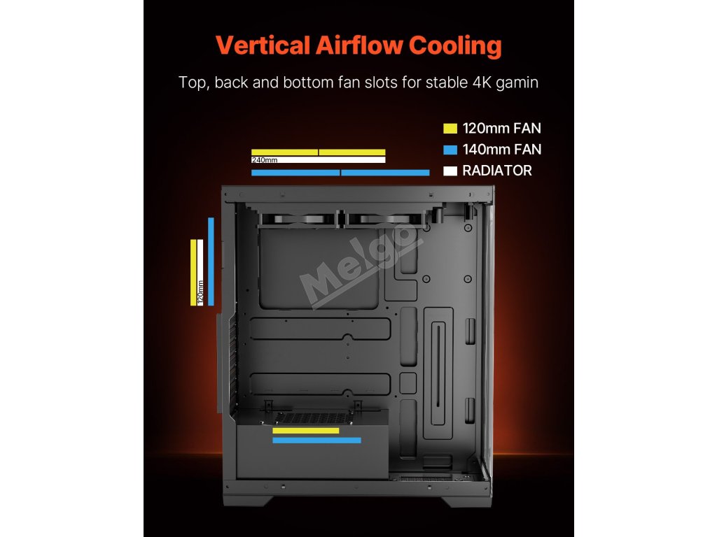 Tato počítačová skříň je vyrobena z vysoce kvalitní oceli SPCC a panelů z dvojitého tvrzeného skla a je kompatibilní se základními deskami ATX. Je vybavena 2 x 120mm ventilátory a podporuje až 4 x 120mm nebo 140mm ventilátory, což zajišťuje výkonné chlazení. Podporuje až 3 pevné disky (2 x 2,5palcový SSD a 1 x 3,5palcový HDD).
