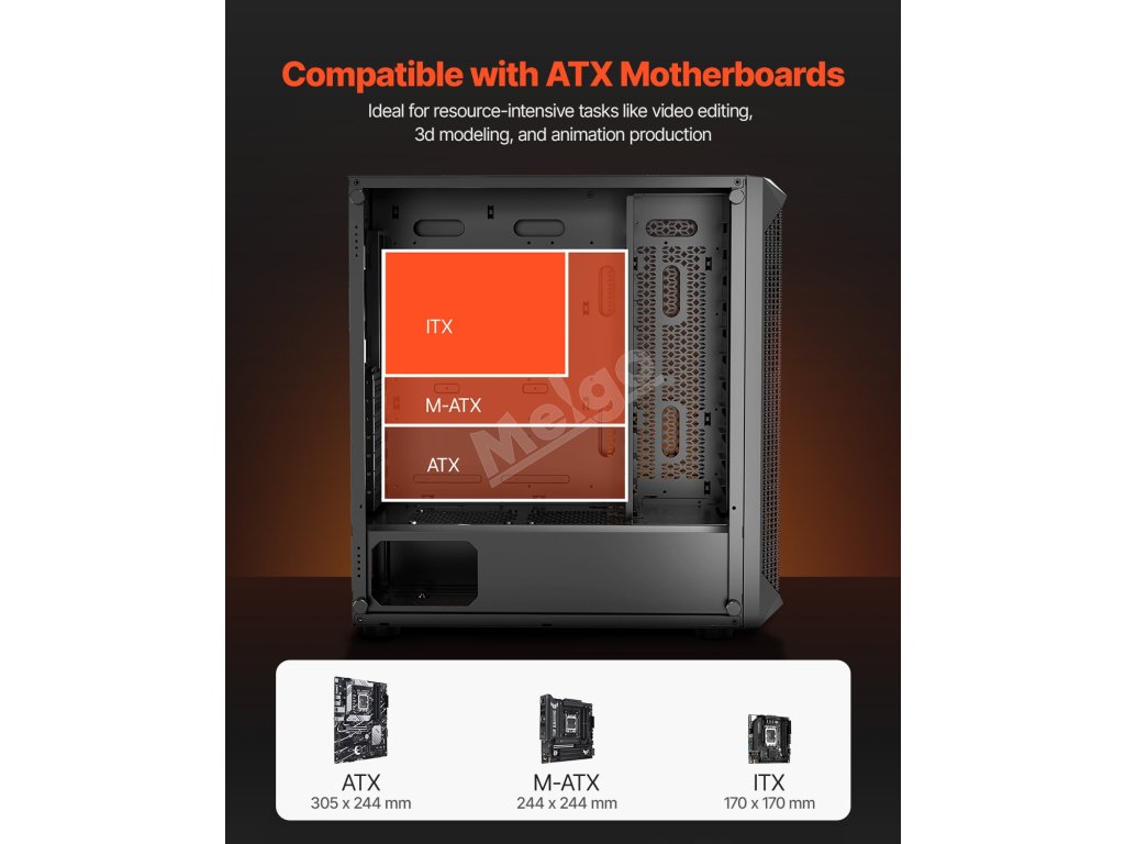 Odpověď: Ano, tato skříň je kompatibilní se základními deskami ATX. Vzhledem k držáku HDD je však maximální podporovaná délka GPU 10,63 palce/270 mm.