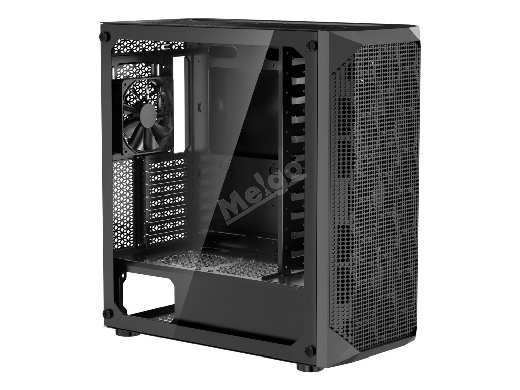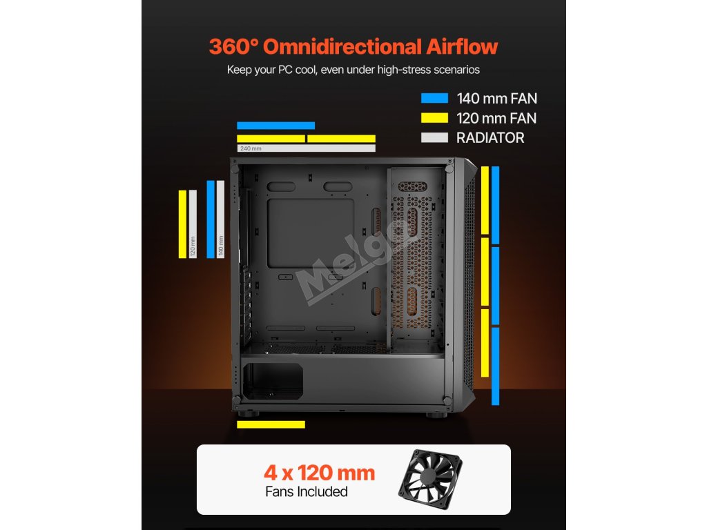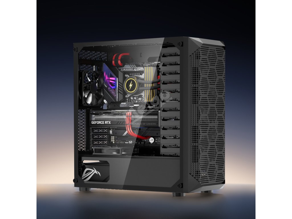 PC skříňka mid-tower s temperovaným sklem, 4×120 mm, pro GPU do 270 mm