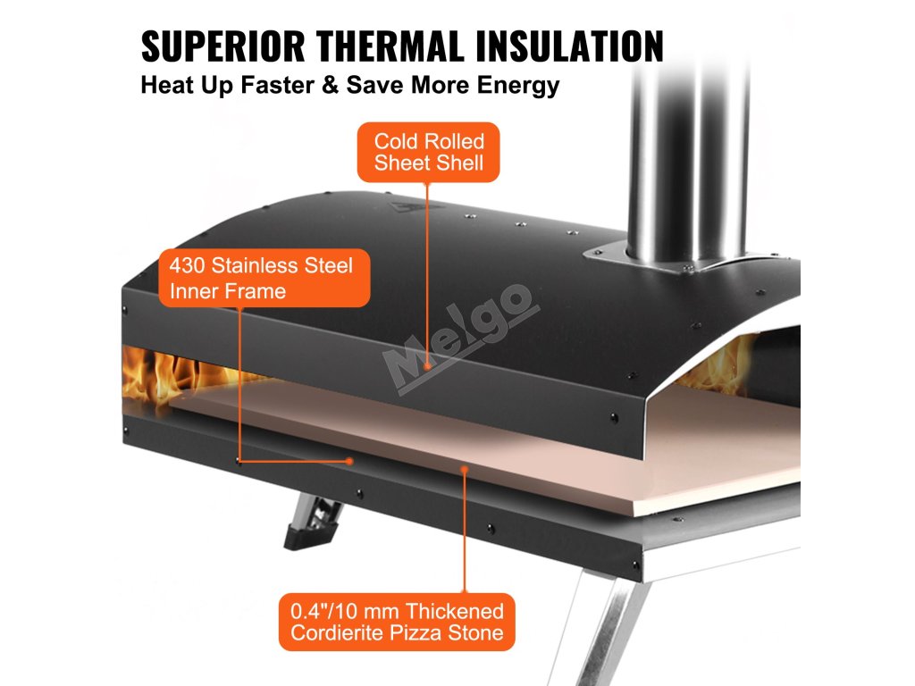 Táto pec na pizzu na drevené uhlie má dvojvrstvovú tepelnoizolačnú štruktúru s materiálmi z nehrdzavejúcej ocele 430 a plechov valcovaných za studena, čo zlepšuje udržiavanie tepla. Táto konštrukcia zabezpečuje rovnomerné a rýchle varenie potravín, takže je ideálna na prípravu pizze, mäsa a zeleniny. Jeho funkcia udržiavania tepla optimalizuje výkon varenia a zakaždým poskytuje dokonale pripravené pokrmy.