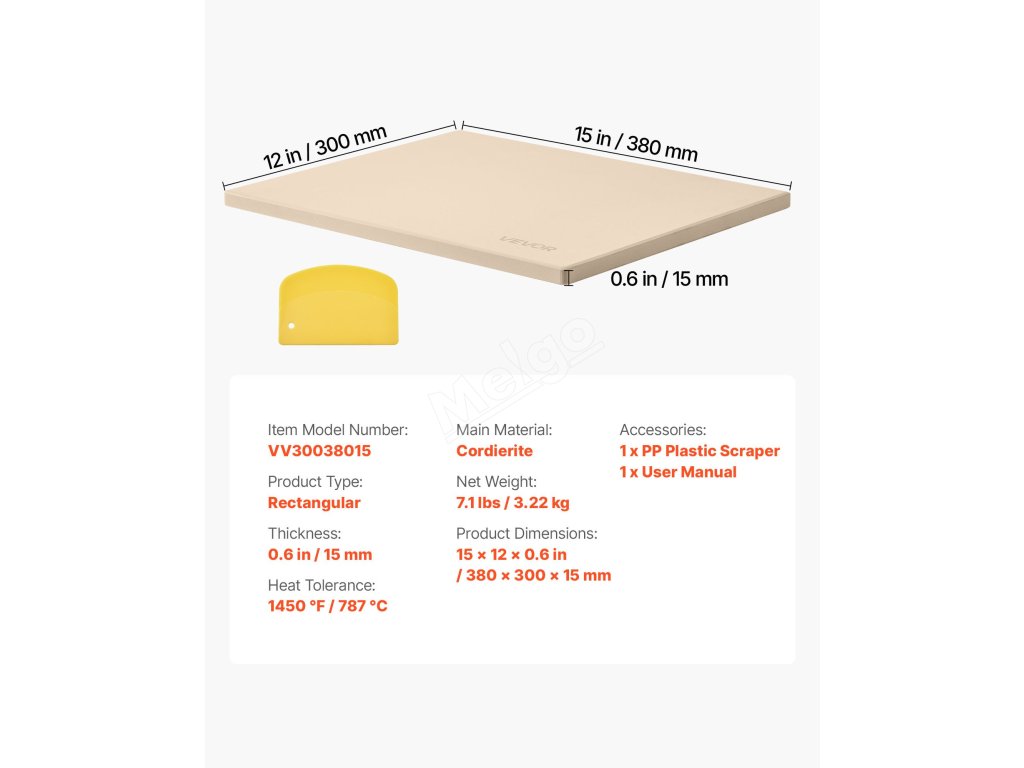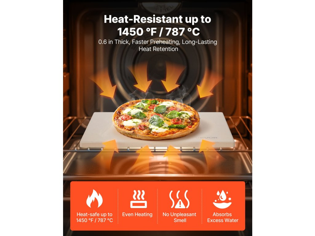 Obdélníkový kámen na pizzu je vyroben ze zesíleného kordieritu odolného vůči vysokým teplotám až 1450 °F/787 °C. Dokáže akumulovat teplo po dlouhou dobu a rovnoměrně vede teplo, čímž zabraňuje rozmočení pizzy a částečnému spálení a zvyšuje úspěšnost pečení.