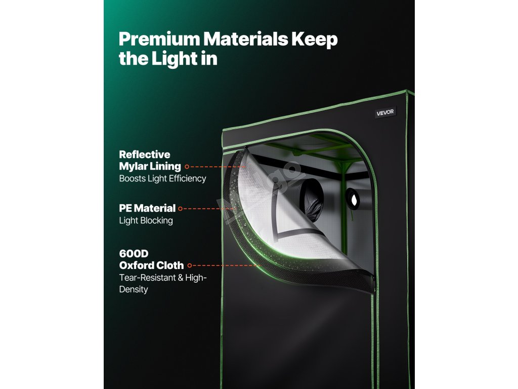 Stan pro pěstování pokojových rostlin je vybaven zipy blokujícími světlo a utěsněnými větracími otvory, které účinně zabraňují úniku světla a zajišťují vašim rostlinám správný cyklus tmy pro zdravý růst a klidový režim. To pomáhá zvýšit celkovou efektivitu pěstování.