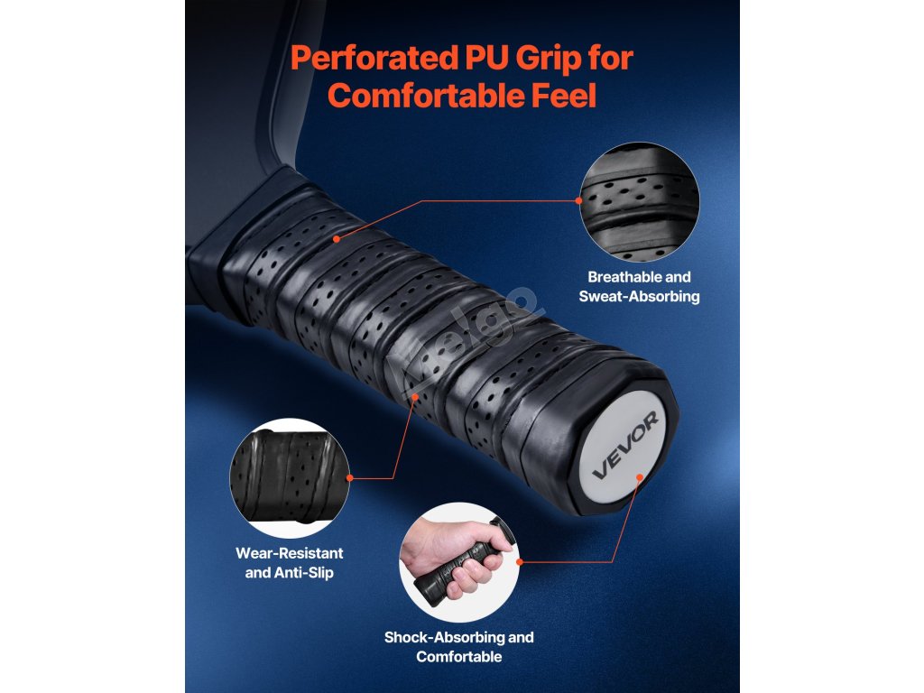 Raketa na pickleball má rukojeť s polstrováním, která pohlcuje pot a zajišťuje stabilní úchop a dlouhotrvající pohodlí při hře. Rukojeť je dokonale dimenzovaná, aby poskytovala maximální pohodlí a kontrolu i při delších sezeních.