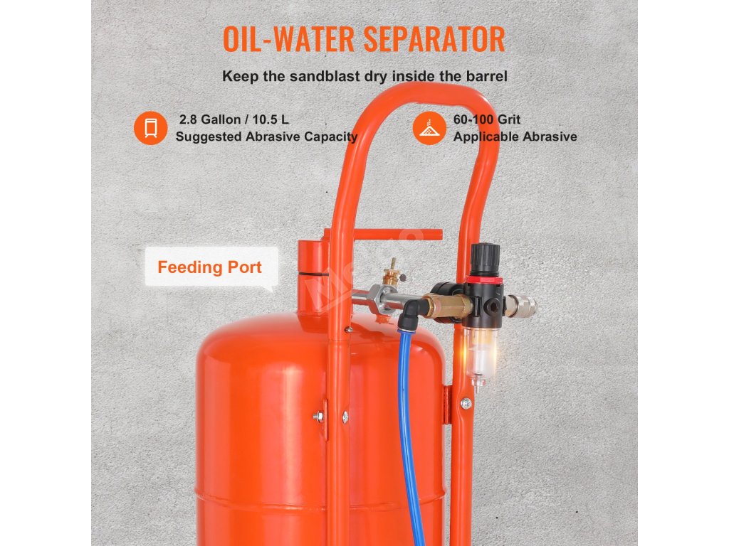 Naše pískovačka je vybavena odlučovačem oleje a vody, který účinně filtruje vlhkost a udržuje abrazivo suché, čímž zabraňuje ucpání ventilu mokrým médiem a zajišťuje plynulé pískování.
