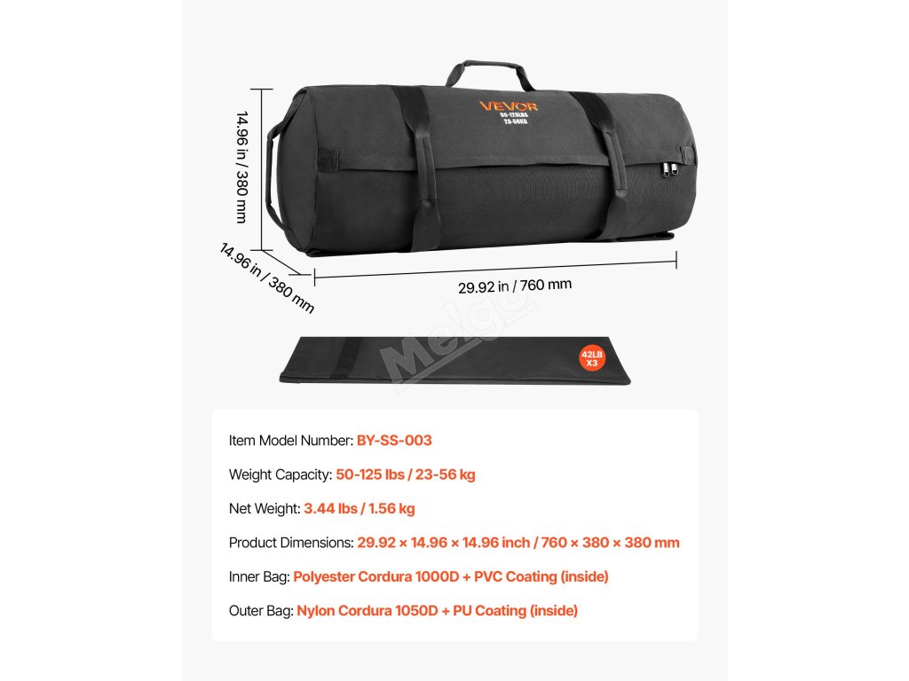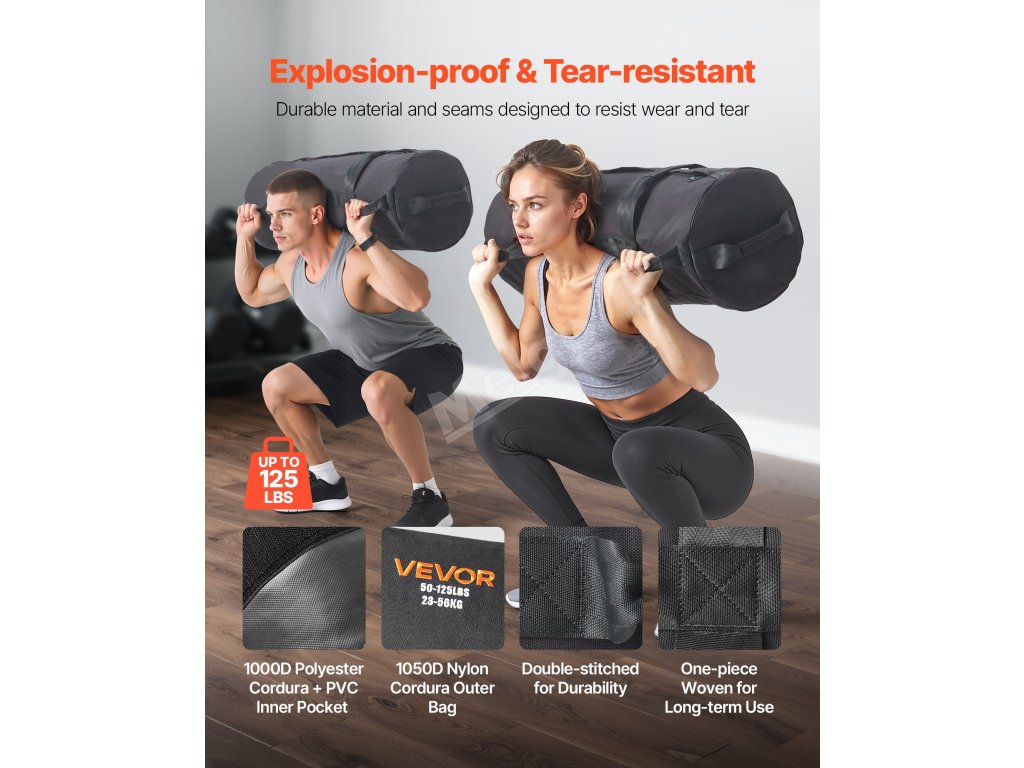 Tento těžký cvičební pytel s pískem je tréninkový nástroj. Vnitřní kapsa je vyrobena z polyesteru Cordura 1000D s povrchovou úpravou PVC a vnější kapsa je vyrobena z nylonu Cordura 1050D. Vak je vyroben z vysoce kvalitních materiálů a má pokročilé těsnění, je odolný, nepromokavý a odolný proti písku, ideální pro všestranný trénink.
