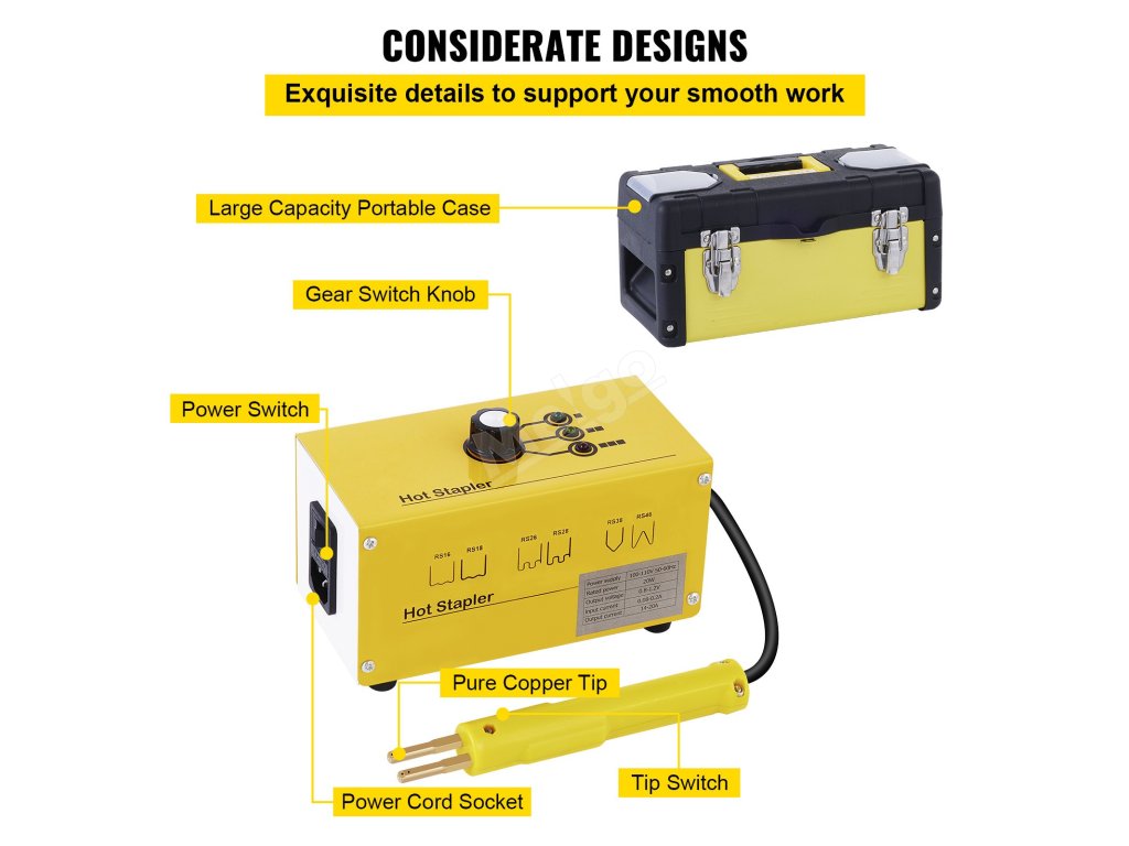 Sada na opravu svařování nárazníků obsahuje různé typy horkých sponek a lze je použít v různých situacích, jako jsou velké a zakřivené trhliny, jemné a rovné trhliny, trhliny ve vnějších rozích a trhliny ve vnitřních rozích.