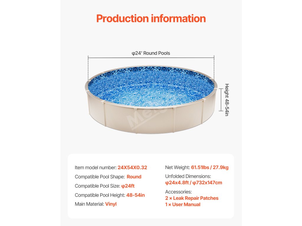 Tato bazénová vložka je vyrobena z odolného vinylu a je určena pro 24stopé kruhové bazény s výškou stěn až 54 palců. Je vyrobena tak, aby dlouho vydržela, odolala opotřebení, proražení a protržení a zároveň nabízí vynikající schopnost zadržovat vodu. Bazénová fólie zaručuje dlouhodobé venkovní použití.