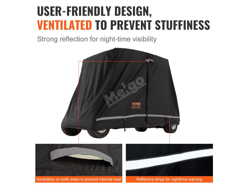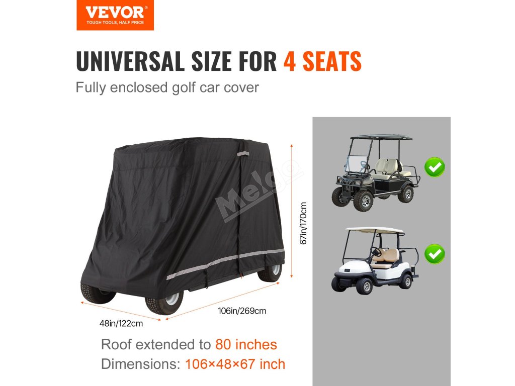 Tento kryt golfového vozíku s prodlouženou střechou do 80 palců je univerzálně vhodný pro 2 nebo 4místná vozidla Yamaha, EZGO a Club Car včetně vozíků 2+2 se zadními sklopnými sedadly. Poskytuje komplexní ochranu díky své plně uzavřené, vodotěsné a prachotěsné konstrukci.