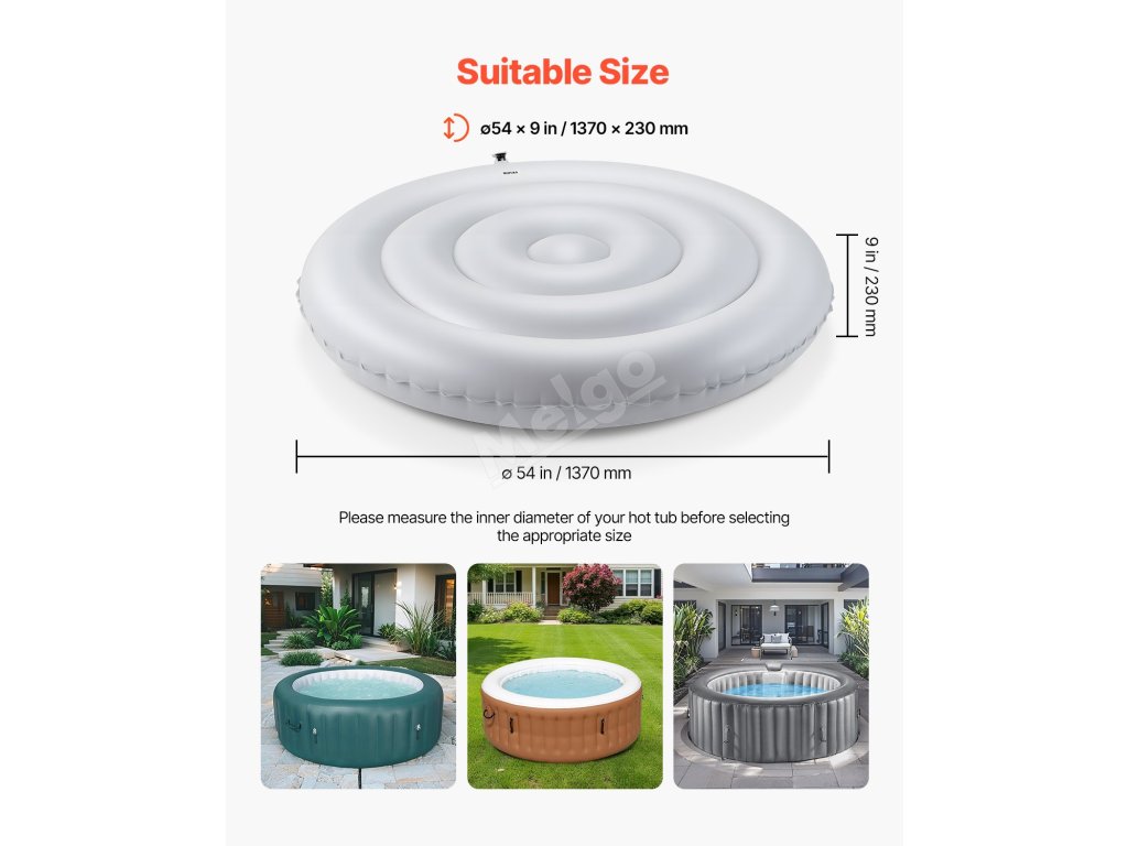 Náš nafukovací kryt na vírivku je určený do vonkajšieho prostredia a je vhodný pre väčšinu veľkostí víriviek s rozmermi ∅54D x 9H in / 1370D x 230H mm. Upozornenie: Nafúknite ho aspoň na 95 %, inak bude mať menšie rozmery.