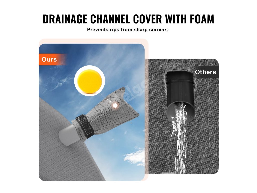 Šest větracích otvorů pomáhá uvolňovat silné proudění vzduchu, zatímco systém celoobvodových spon a popruhů udržuje tvar krytů pro obytné přívěsy. Tato konstrukce zabraňuje nafouknutí krytu při silném větru a zabraňuje jeho roztržení nebo odfouknutí.