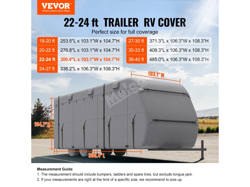 Náš kryt cestovního přívěsu třídy A je pečlivě navržen tak, aby se vešel do obytných vozů o rozměrech 22-24'' a poskytoval maximální ochranu. Pro správnou instalaci se ujistěte o přesných rozměrech vašeho obytného vozu. Nabízíme také různé velikosti potahů na obytné vozy, které splní vaše specifické potřeby.