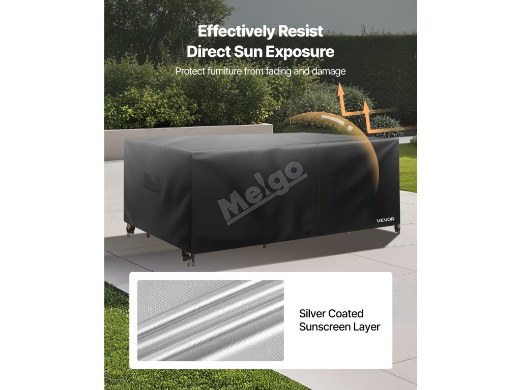 Kryt na terasový nábytek má univerzální velikost a poskytuje spolehlivou ochranu pro různé tvary a velikosti venkovního nábytku. Zabraňuje poškození vlivem počasí, udržuje váš venkovní stůl a židle ve skvělém stavu a prodlužuje jejich životnost.