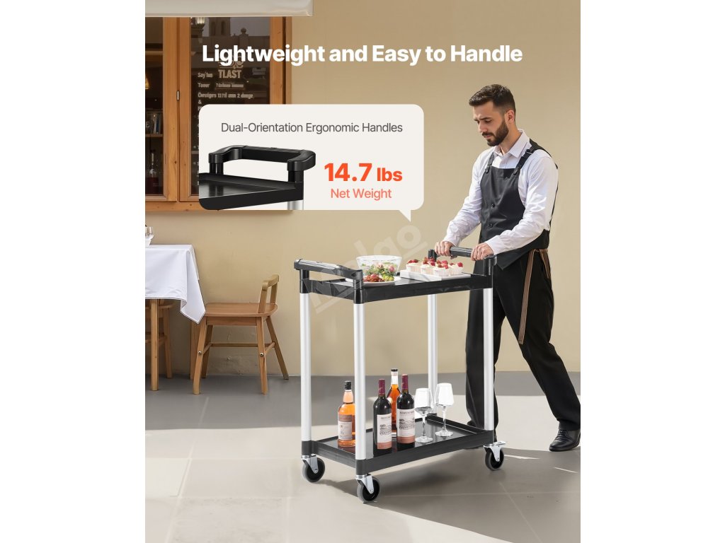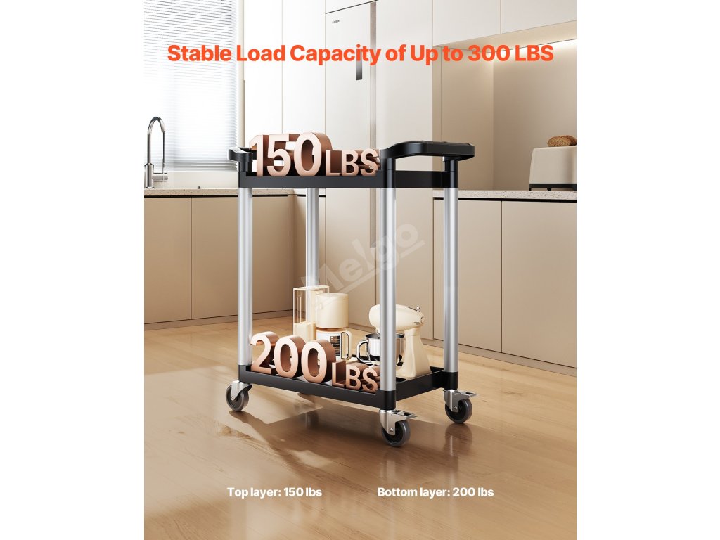 Náš dvouúrovňový užitkový vozík unese až 300 kg - 150 kg na horní polici a 200 kg na spodní polici. Je ideální pro přepravu více předmětů najednou nebo pro uložení věcí, kdekoli je potřebujete.