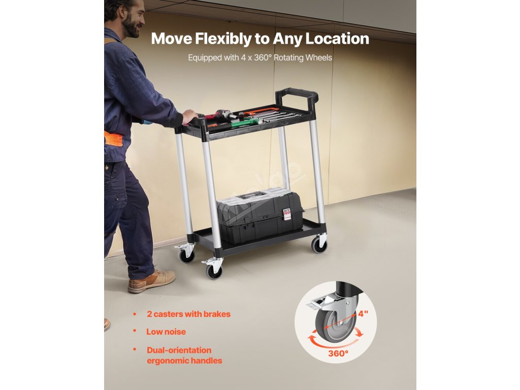 Plast. 2-podlažní vozík 300 lbs 360° kola 2 s brzdou 24.4×16.1-inch