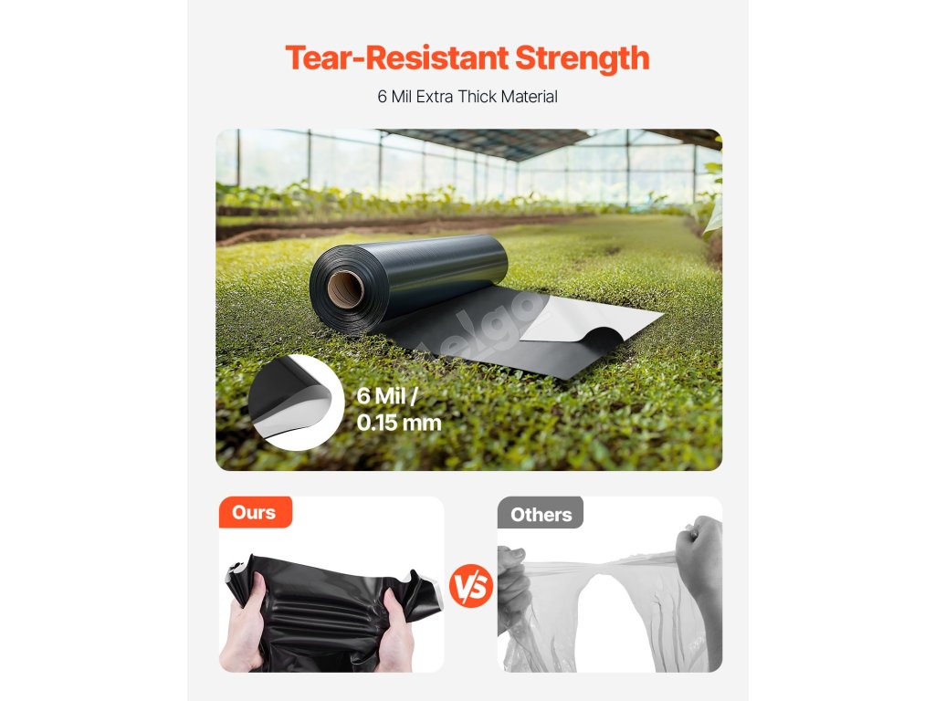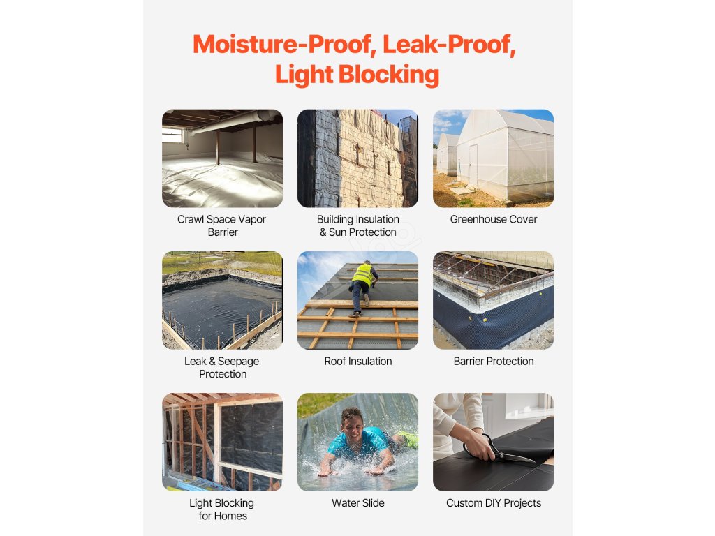 Táto plastová fólia s hrúbkou 6 milimetrov pre vysokú odolnosť proti roztrhnutiu a trvanlivosť. Veľkorozmerná plastová fólia s rozmermi 10 stôp x 100 stôp (3,05 m x 30,48 m) pokrýva rozsiahle plochy. Obojstranný čierno-biely dizajn na odrážanie svetla, blokovanie a reguláciu vlhkosti, ideálny pre potreby stavby.
