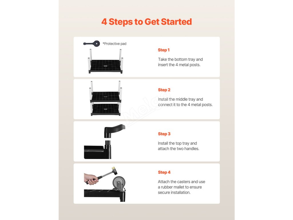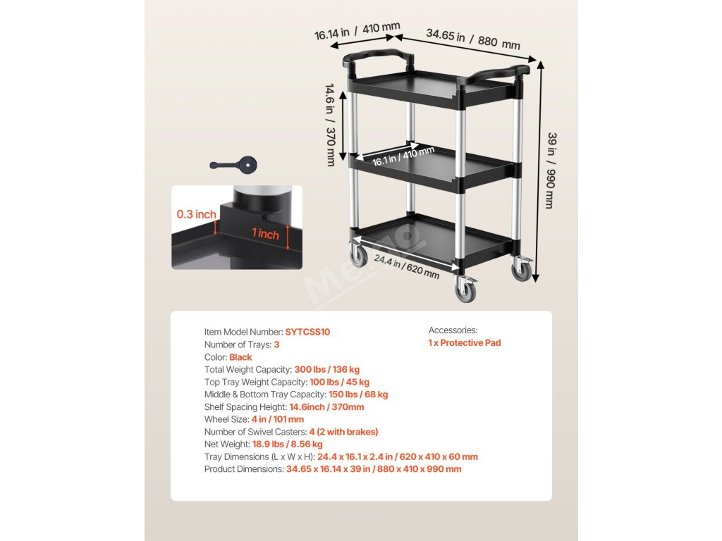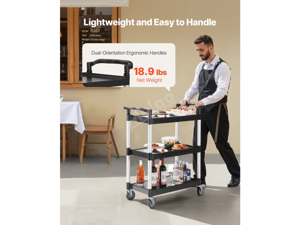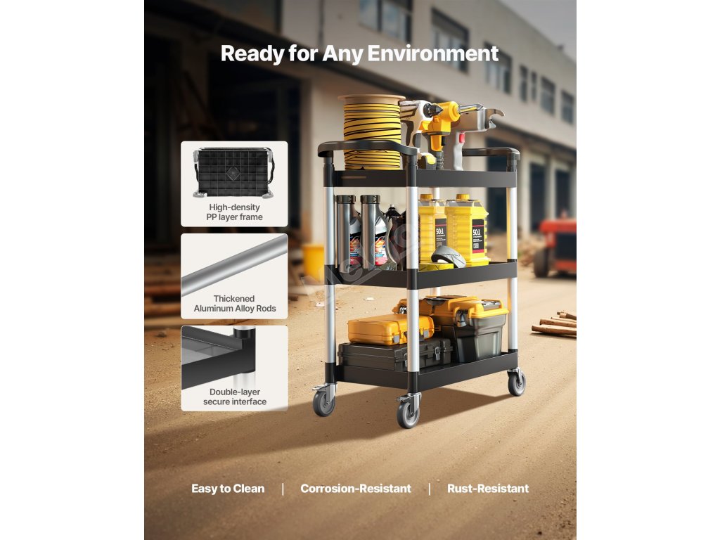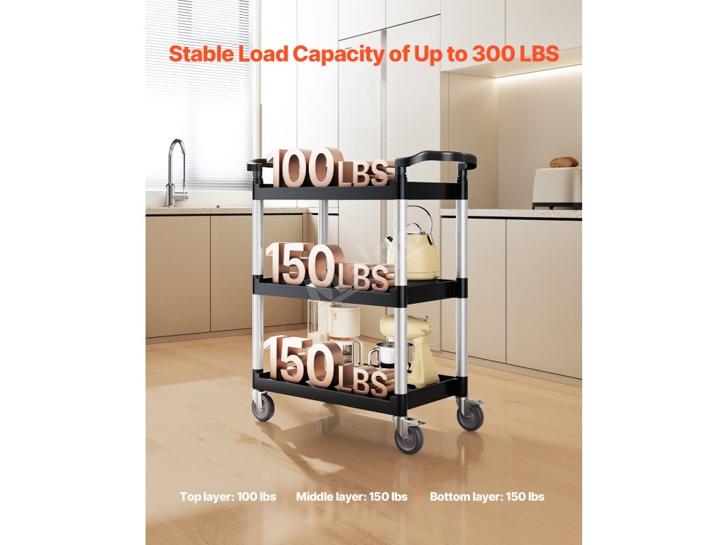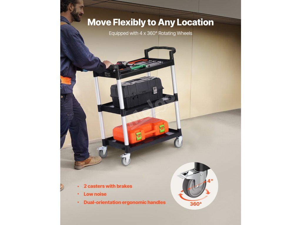 Plastový 3-patrový vozík, 300 lbs, 360°/2 brzd., 24.4×16.1-inch
