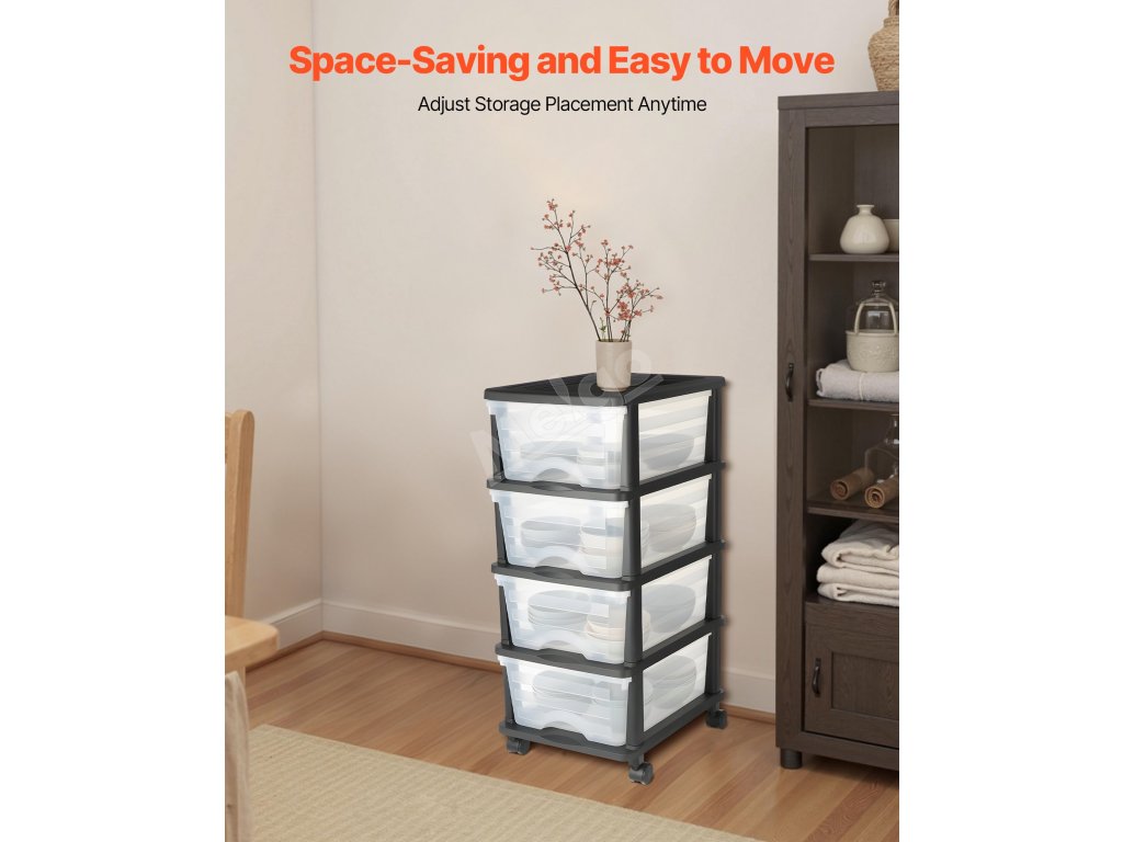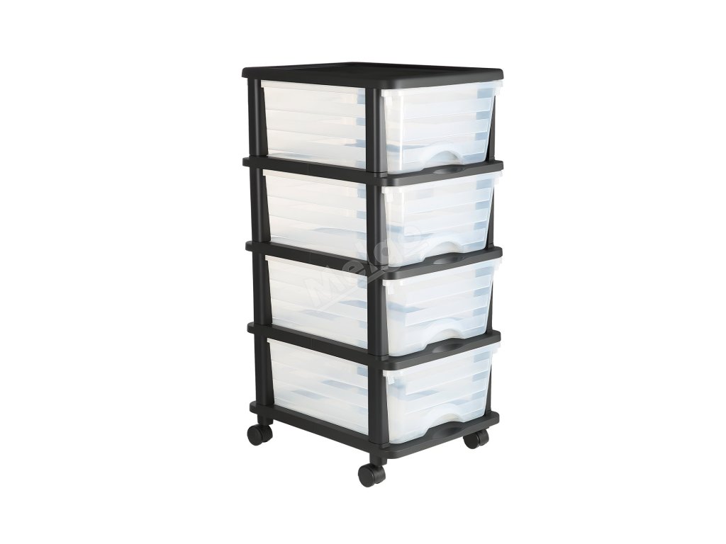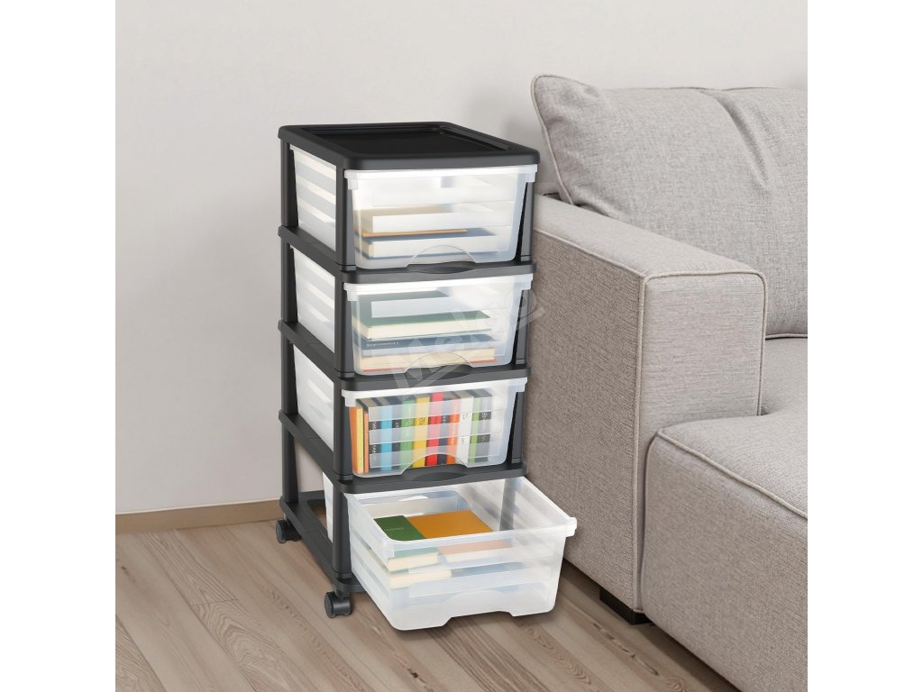 Plastový vozík se 4 zásuvkami, na kolečkách, průhledné přihrádky