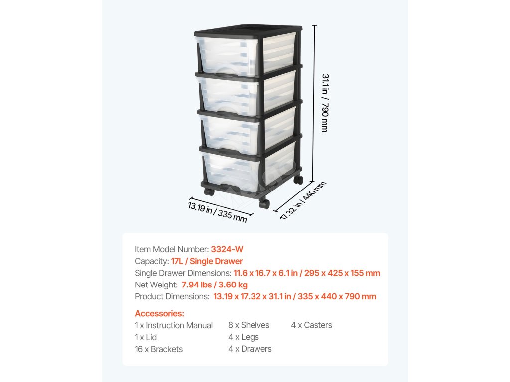 | Rozměry jedné zásuvky | 11.6 x 16,7 x 6,1 palce / 295 x 425 x 155 mm |