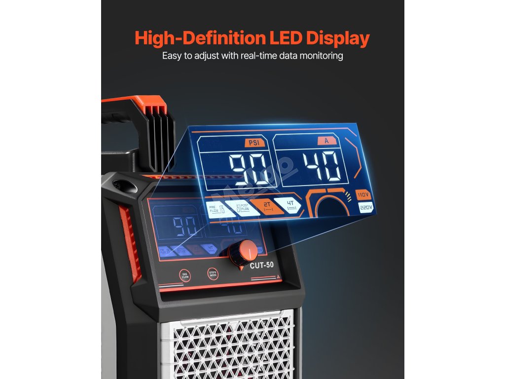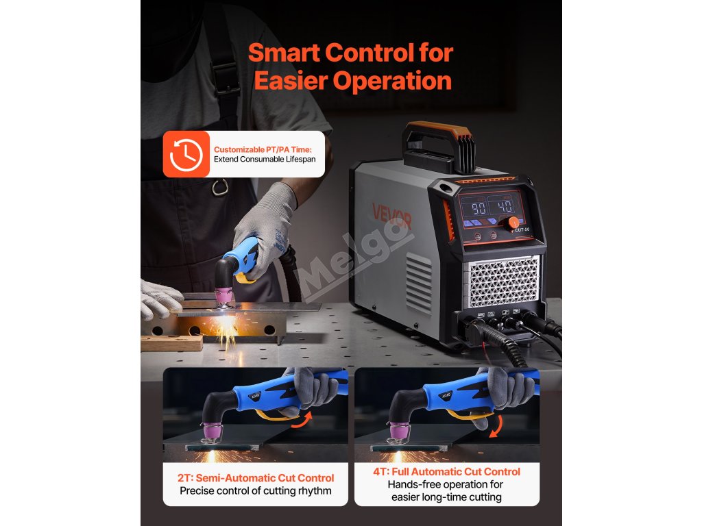 Tato plazmová řezačka poskytuje výkon 50 A, který umožňuje snadné řezání různých kovů. Je vybavena bezkontaktním pilotním obloukem, inteligentním ovládáním, funkcí 2T/4T a přehledným digitálním displejem a poskytuje stabilní výstup pro hladké a efektivní řezání v domácích garážích a opravnách.